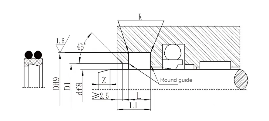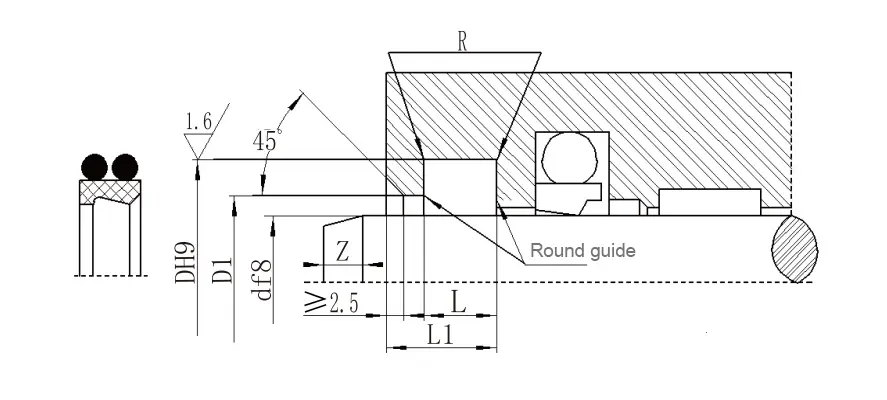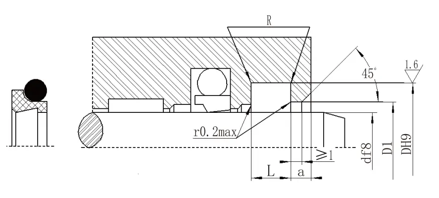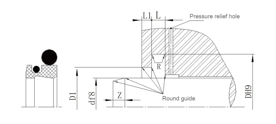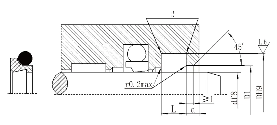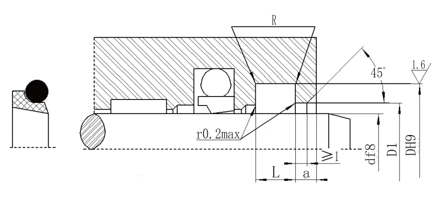 | Julat diameter aci d f8 | Diameter alur DH9 | Diameter langkah D1 H11 | Lebar alur L+0.2 |