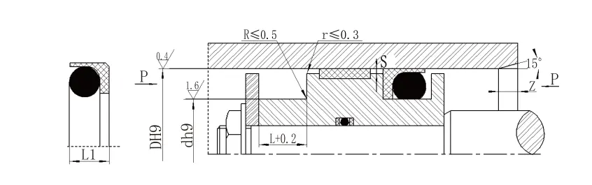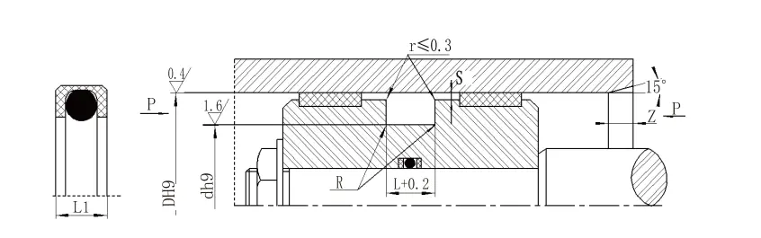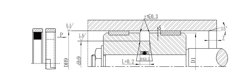 Julat Aperture D H9 | Diameter alur D H9 | Lebar alur L.+0.2 | Ketinggian meterai L1 | Sudut bulat Rmaks | Pelepasan radial smaks | Chamfer Zmin | O-ring diameter dawai dO | |