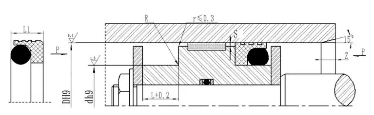 Julat Aperture Jenis standard D H9 RC2062 | Julat Aperture Jenis Berat D H9 RC2062-Z | Diameter alur D H9 | Lebar alur L.+0.2 | Lebar meterai L1 | Sudut bulat rmaks | Pelepasan radial smaks | Chamfer Zmin | O-ring diameter dawai | ||